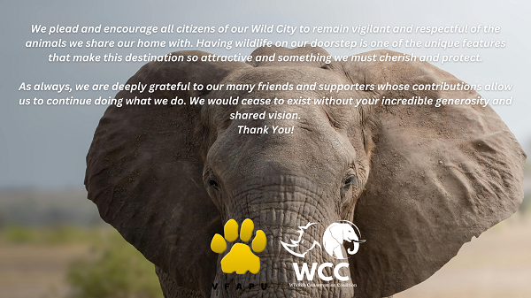 The co-existence we have in our beloved City is something we can always be proud of. But we have maintained that it is not perfect. Our day to day job focuses on the human conflict on the environment, namely poaching. However, the element of animals conflicting with humans is very real. Every wildlife incursion into our streets has the potential of turning nasty. Fortunately, our City embraces its wild nature, and the vast majority of encounters are peaceful and without incident.
